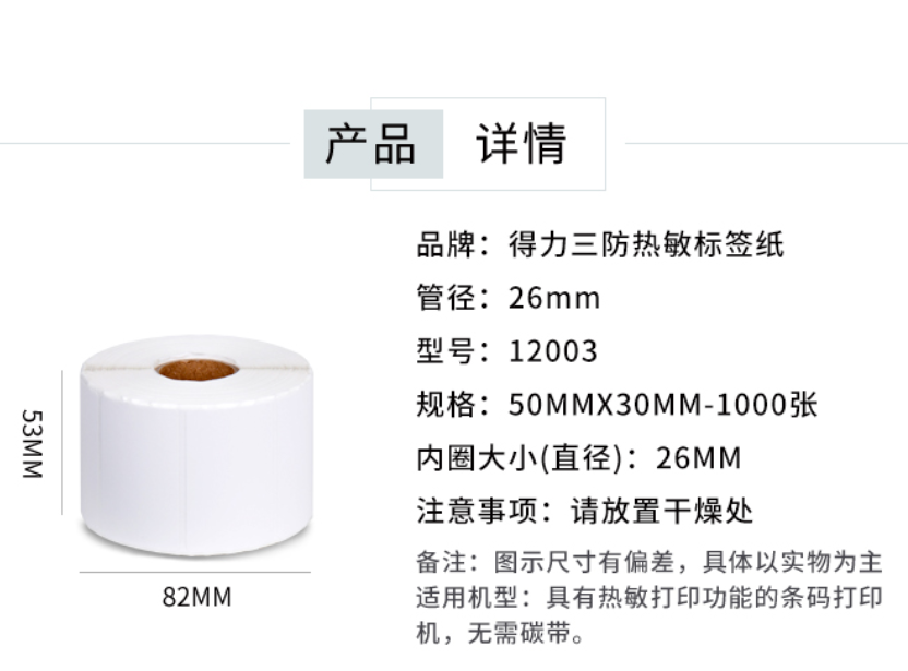 得力 三防热敏标签纸 50*30mm 1000张/卷 12003